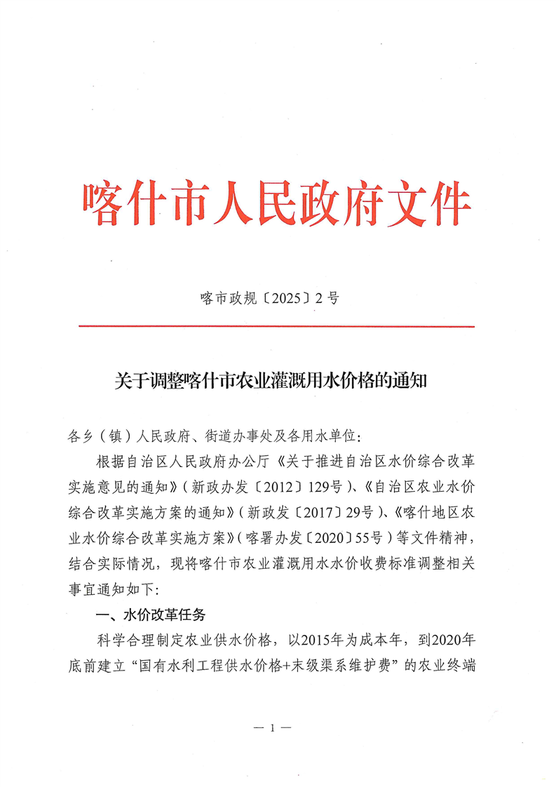 | 內容概述 | 根據自治區人民政府辦公廳《關于推進自治區水價綜合改革實施意見的通知》(新政辦發〔2012〕129號)、《自治區農業水價綜合改革實施方案的通知》(新政發〔2017〕29號)、《喀什地區農業水價綜合改革實施方案》(喀署辦發〔2020〕55號)等文件精神。 | ||