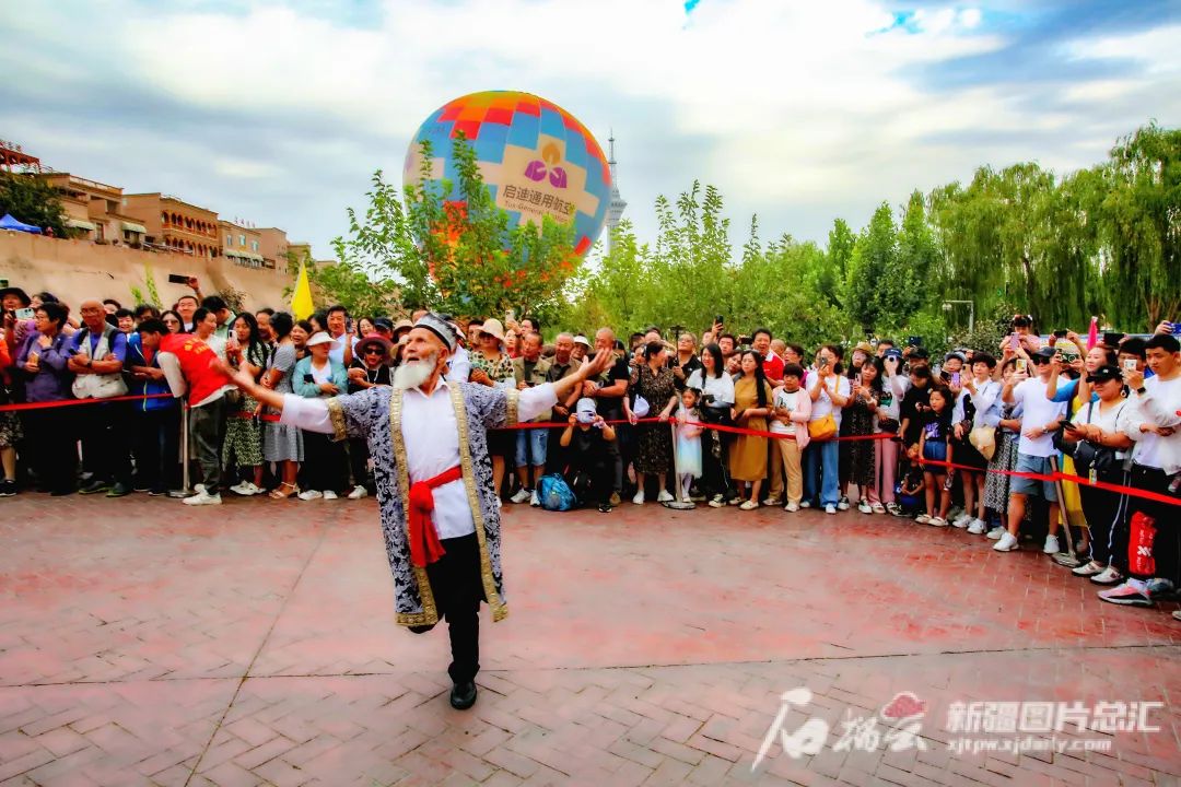 8月23日,喀什古城景區開城儀式上,“網紅大爺”踏著鼓點翩翩起舞迎接八方游客