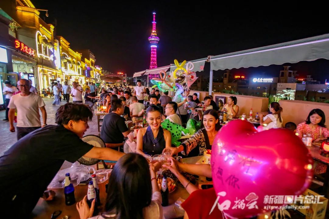 傍晚時分,伴隨著火紅的晚霞,喀什古城華燈初上,璀璨耀眼,曲徑通幽的街巷里歌聲不斷,美食飄香,大街小巷到處都充斥著人間煙火氣,游客們盡享古城愜意時光。