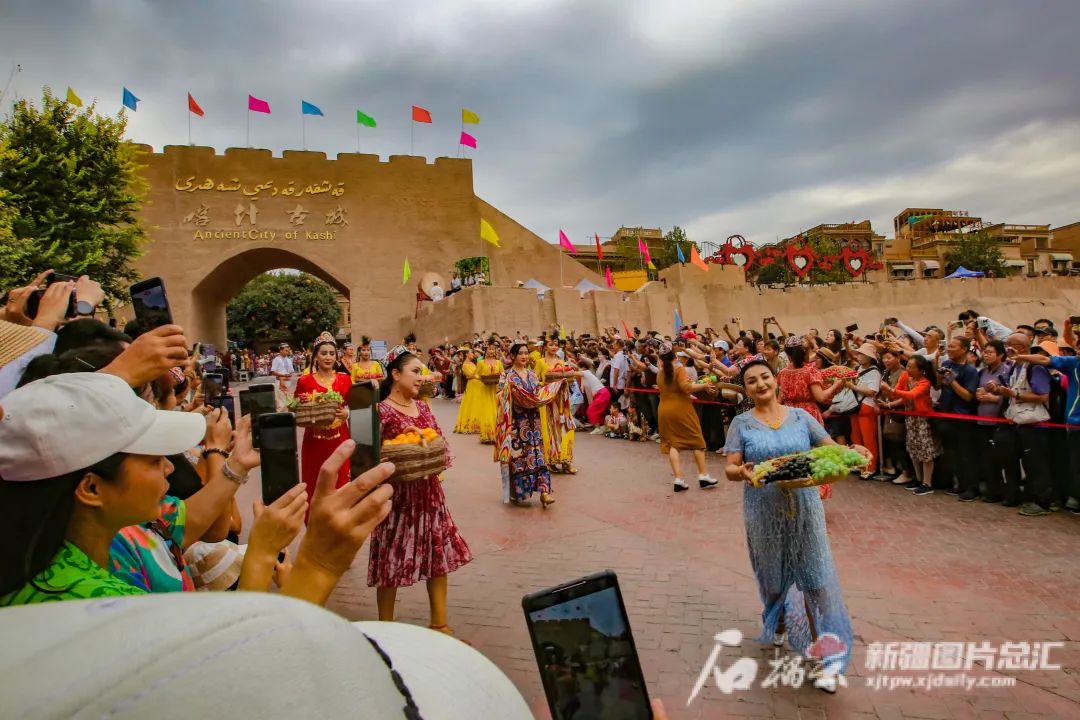 8月23日,喀什古城景區開城儀式上,工作人員端著果盤迎接游客