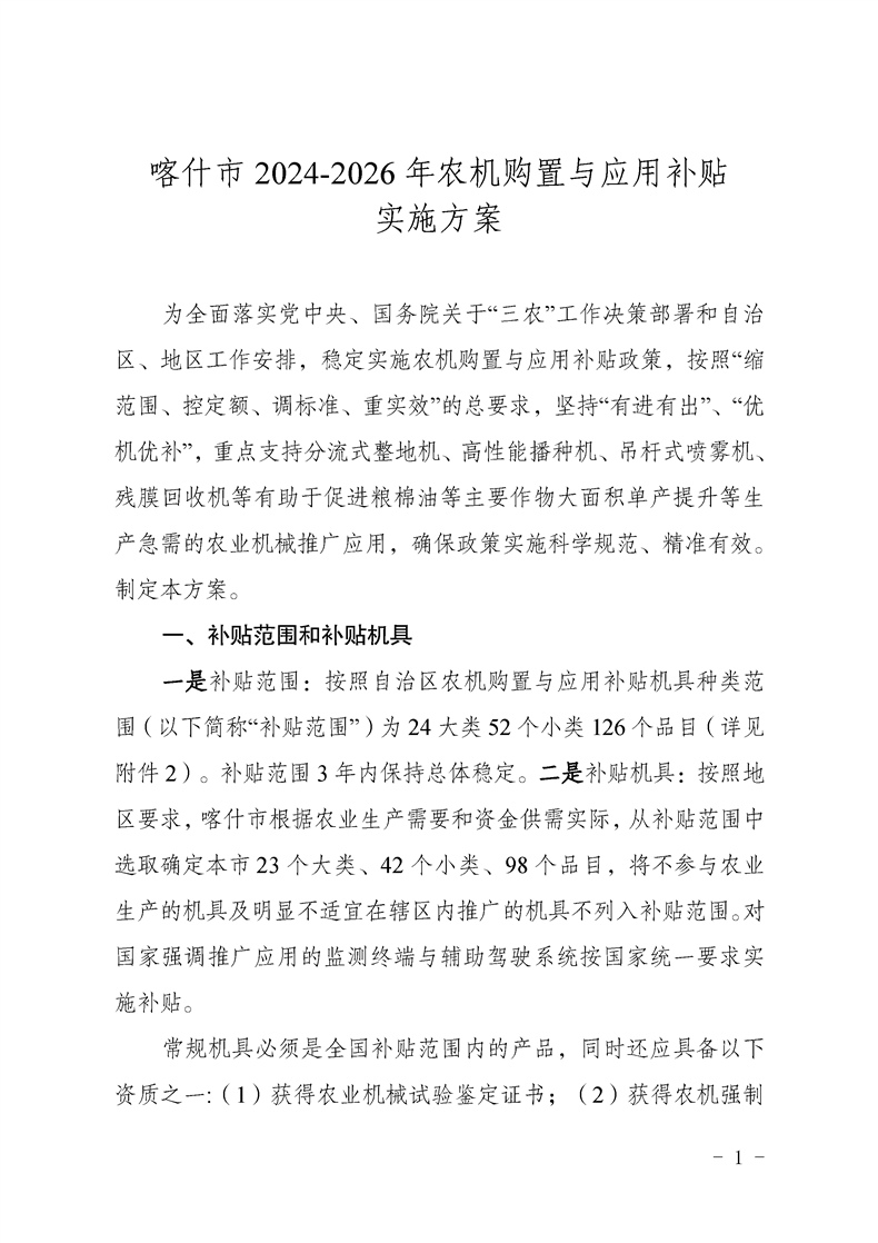 關(guān)于印發(fā)《喀什市2024-2026年農(nóng)機(jī)購(gòu)置與應(yīng)用補(bǔ)貼實(shí)施方案》的通知