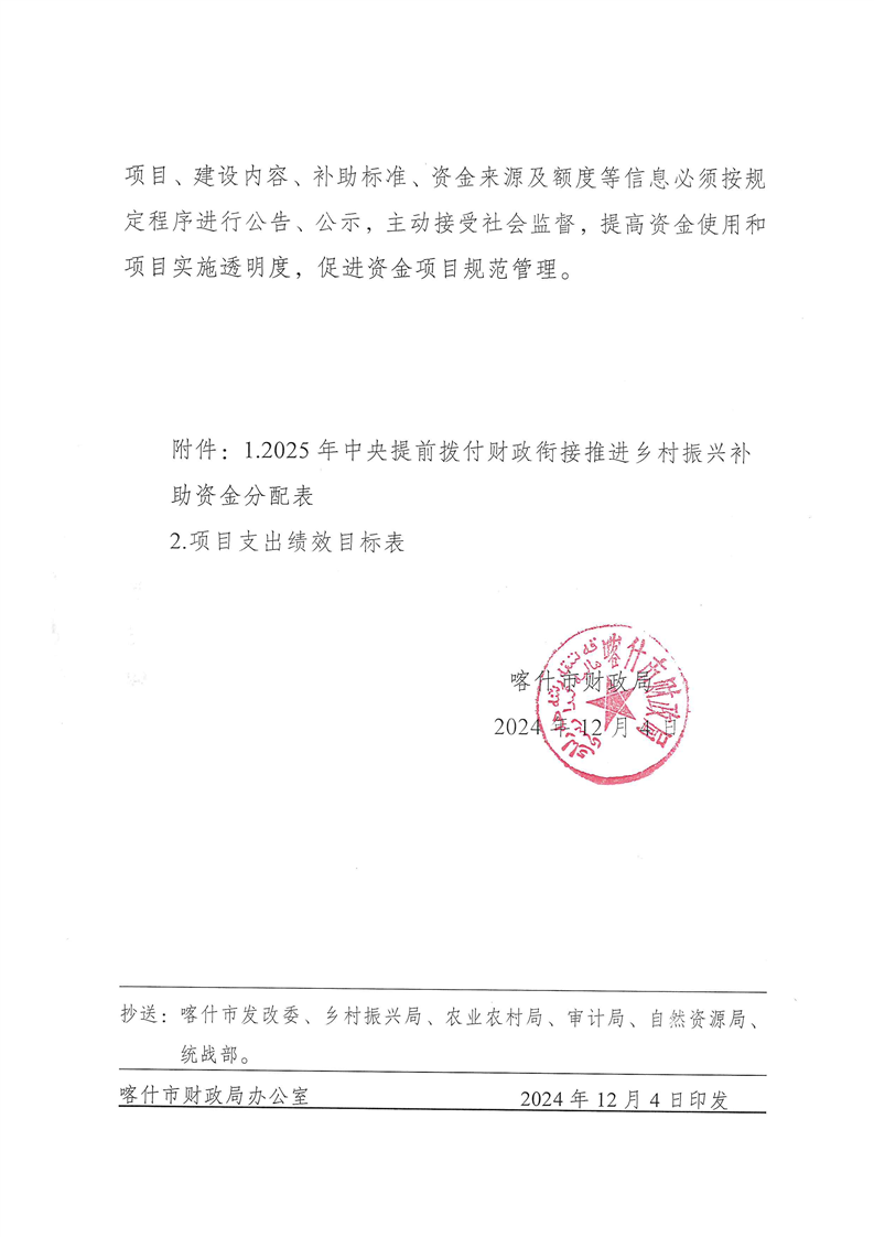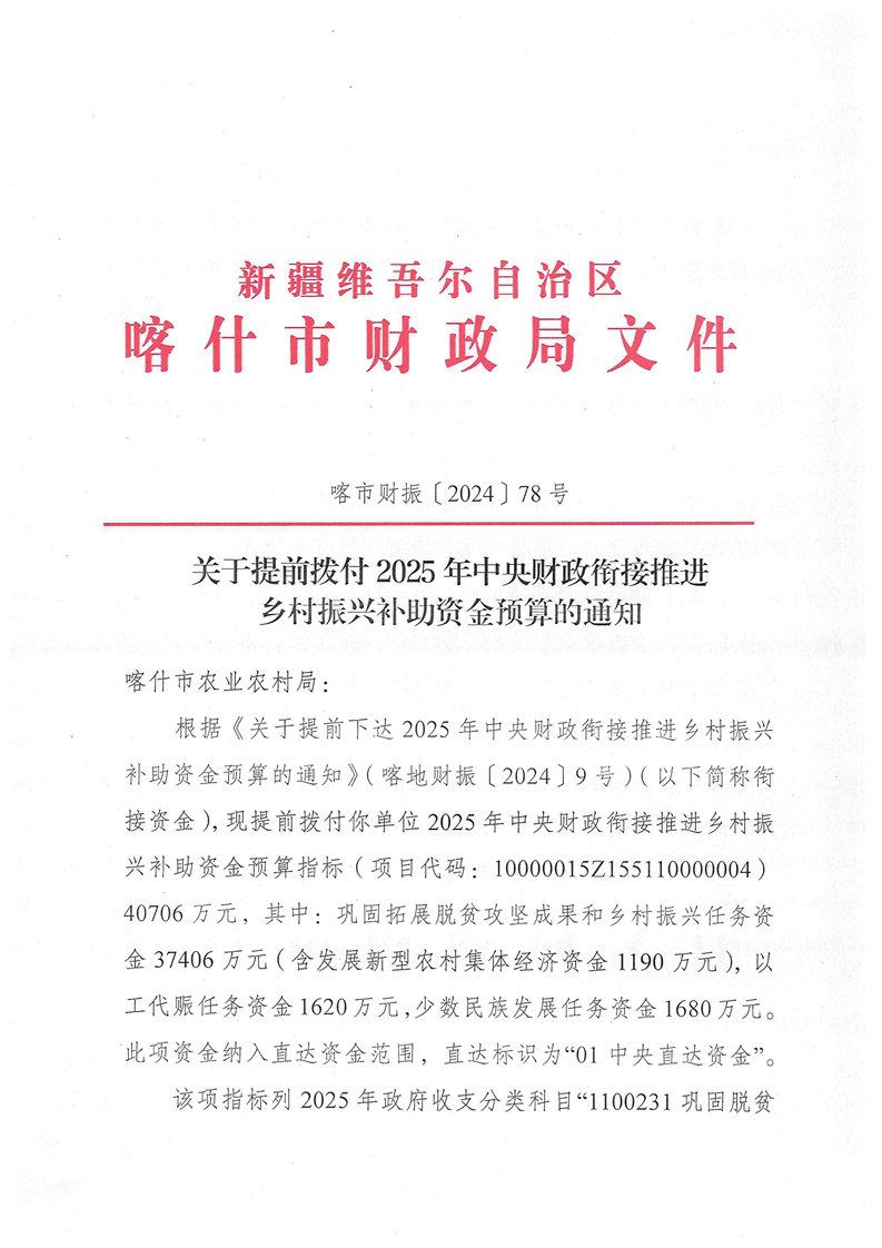 《喀市財(cái)振〔2024〕78號(hào)—關(guān)于提前撥付2025年中央財(cái)政銜接推進(jìn)鄉(xiāng)村振興補(bǔ)助資金預(yù)算的通知》